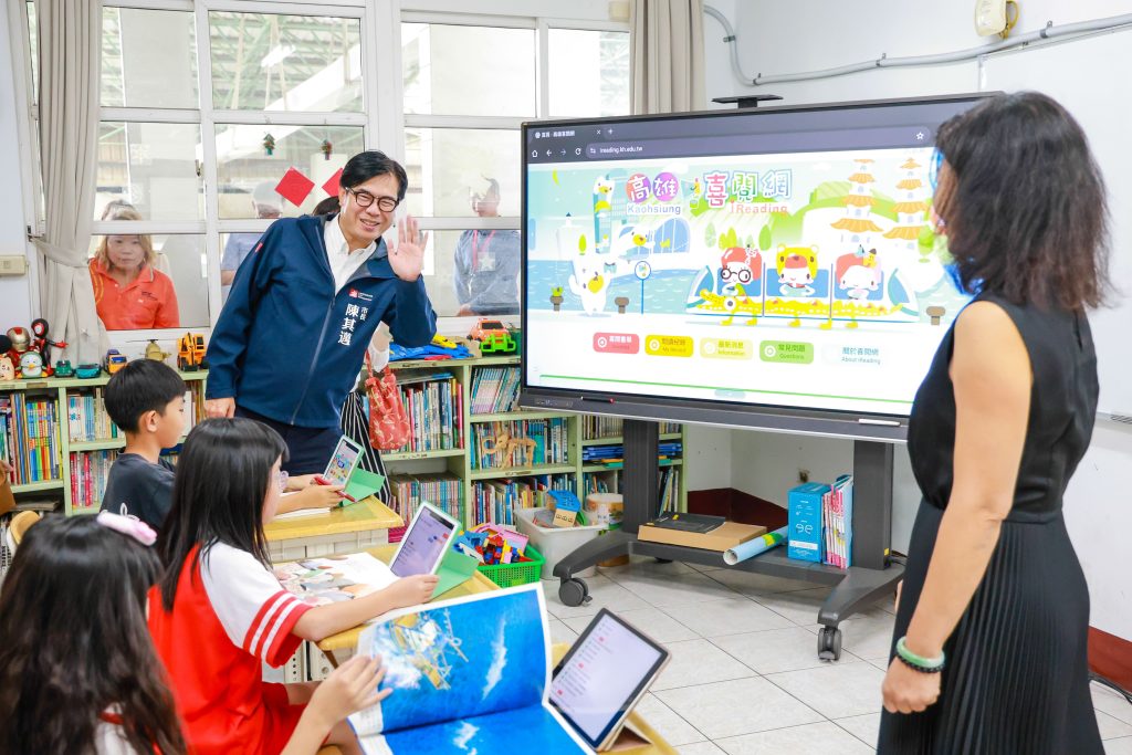 Mayor Chen Chi-mai (陳其邁), Kaohsiung City Council Speaker Kang Yu-cheng (康裕成), Legislator Lee Kun-tze (李昆澤), and several city councilors visited Dashu Elementary School (大樹國小) and Kaisyuan Elementary School (凱旋國小) on Monday to observe how the new equipment is being used in class.