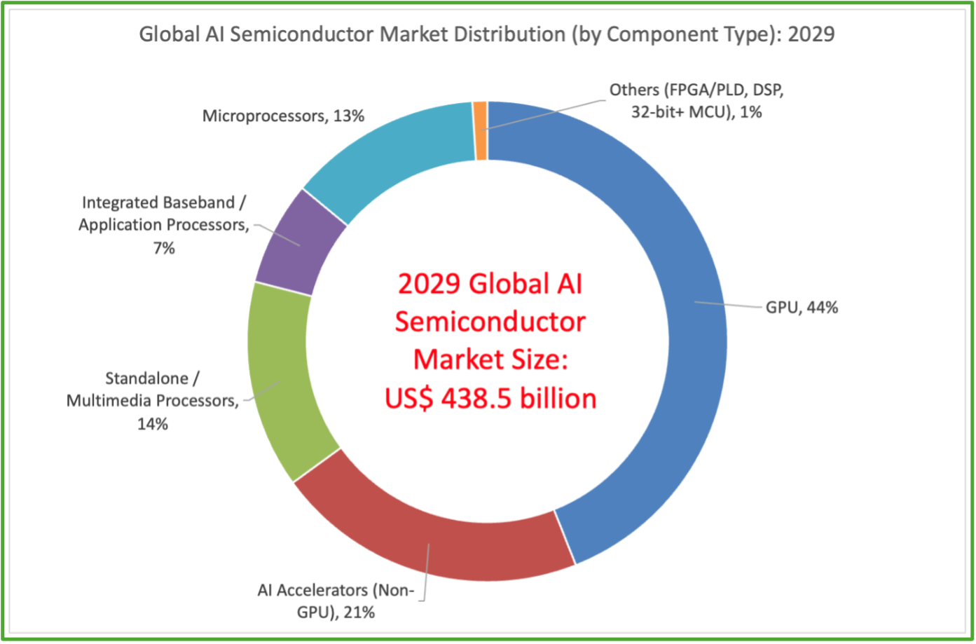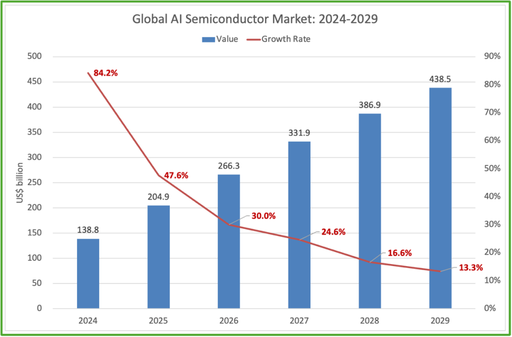 As AI applications expand from cloud data centers toward edge computing environments, the market is entering a phase of rapid yet sustainable growth. The AI semiconductor market is projected to reach US$204.9 billion in 2025, representing a year-on-year growth rate of 47.6%. Looking further ahead, the market is expected to grow to US$438.5 billion by 2029, maintaining a robust compound annual growth rate of 25.9%.