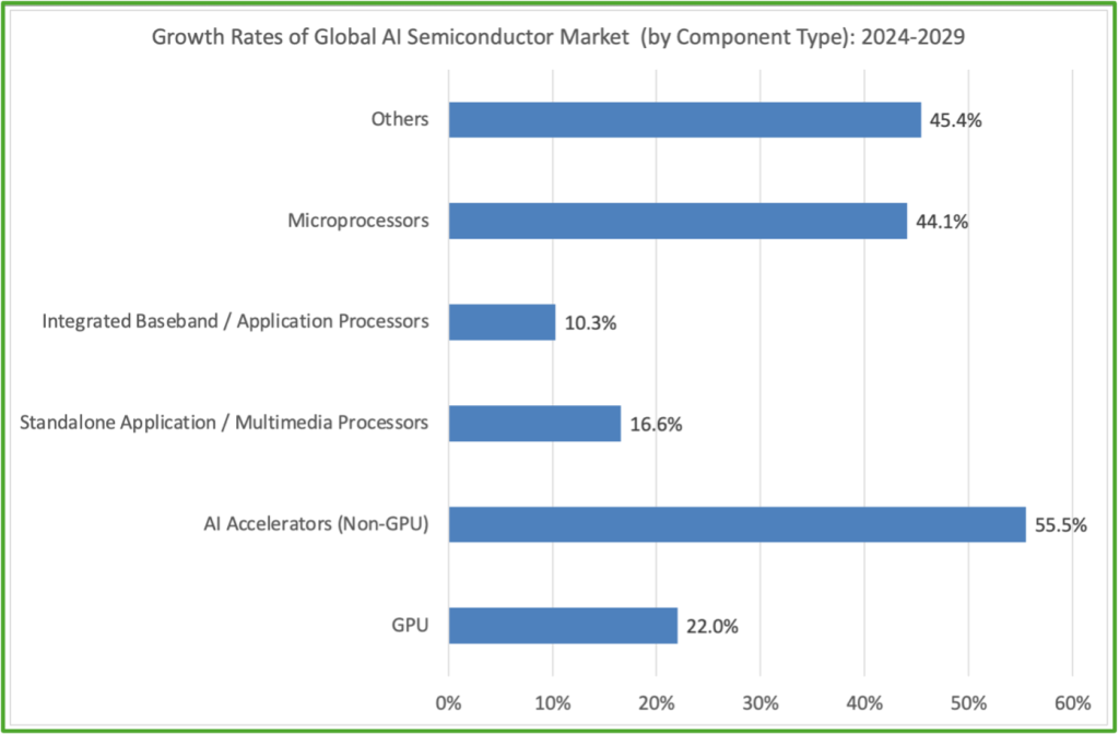 The most transformative force reshaping the industry lies in non-GPU AI accelerators. This segment is projected to grow from 7% market share in 2024 to 21% by 2029, with a striking CAGR of 55.5%, the fastest among all chip categories.