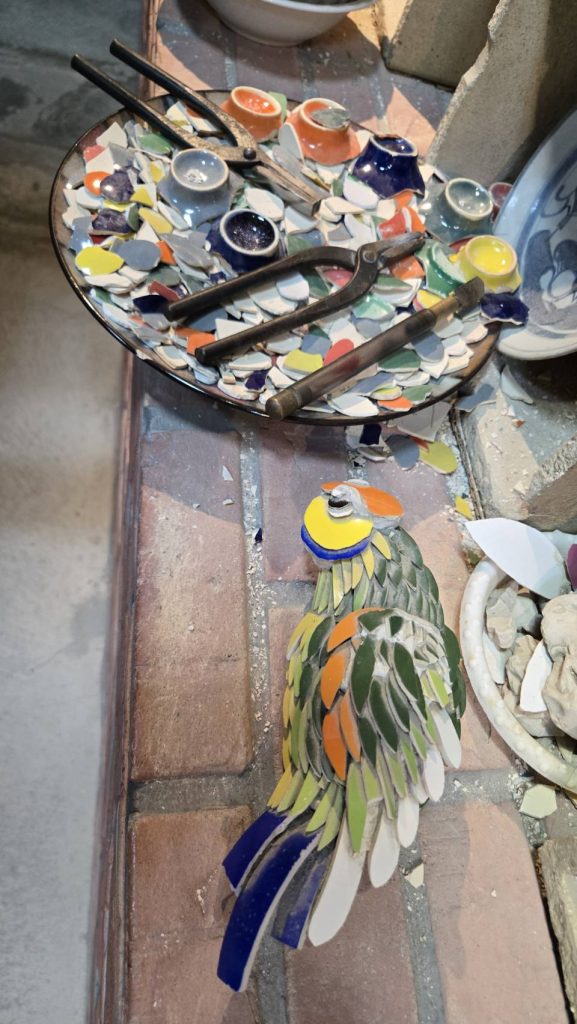 The “scales” that make up a decorative dragon, for example, are made by breaking ceramic bowls. A tool helps mark the break line, and then it’s turned into a scale-like piece that’s cemented onto a frame. The technique uses steel wire as “bones” and plaster as “flesh.” Artisans then use pincers to clip bits of colored ceramics. Embedded in the plaster, these clips become the skin.