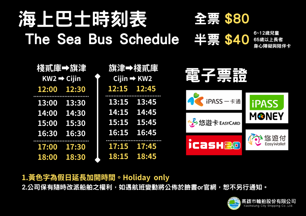 The most popular tourist “sea-bus” ferry used now is the Gushan-KW2-Cijin route, which starts from Gushan Ferry Terminal, passes through KW2 (the area of Pier 2 with century-old warehouses), and arrives at Cijin Ferry Terminal. It then follows the same route back to Gushan Ferry Terminal. The schedule for that is below: