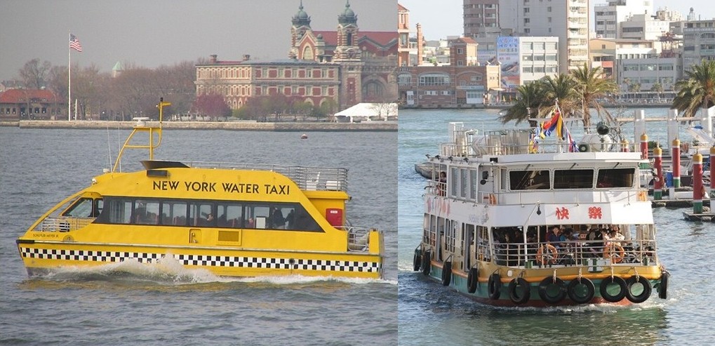 Wiki Commons image on the left shows a New York City Water Taxi. On the right is one of the Gushan-Cijin Ferries.
