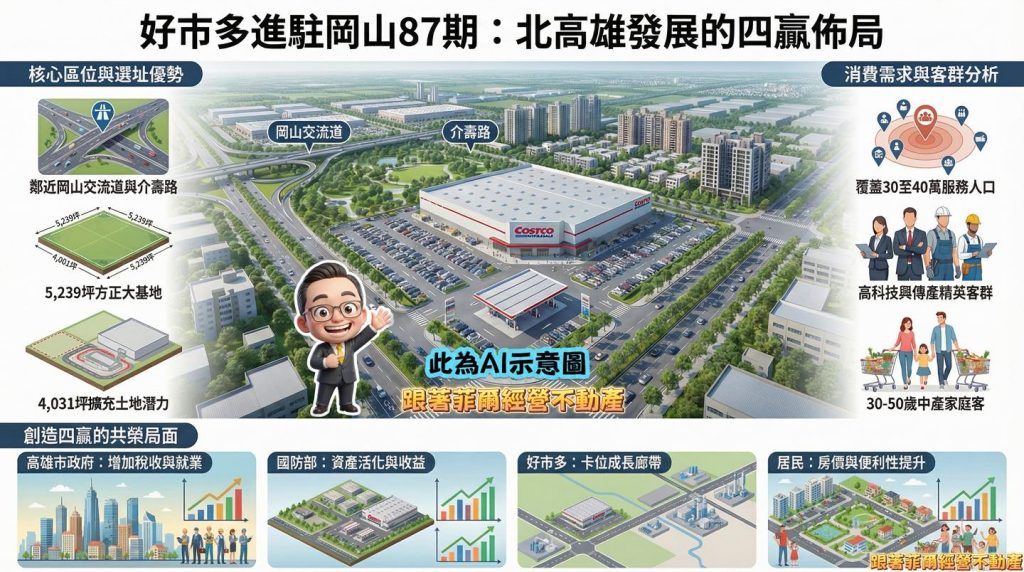 Experts say membership-based warehouses typically require extensive sites capable of handling building footprints, parking, logistics circulation, and long-term expansion. The Gangshan (岡山) 87th rezoning area is often highlighted because it aligns with these requirements. The site offers relatively rare large-scale land availability, proximity to major arterial roads and the Gangshan interchange, and enough separation from older urban neighborhoods.