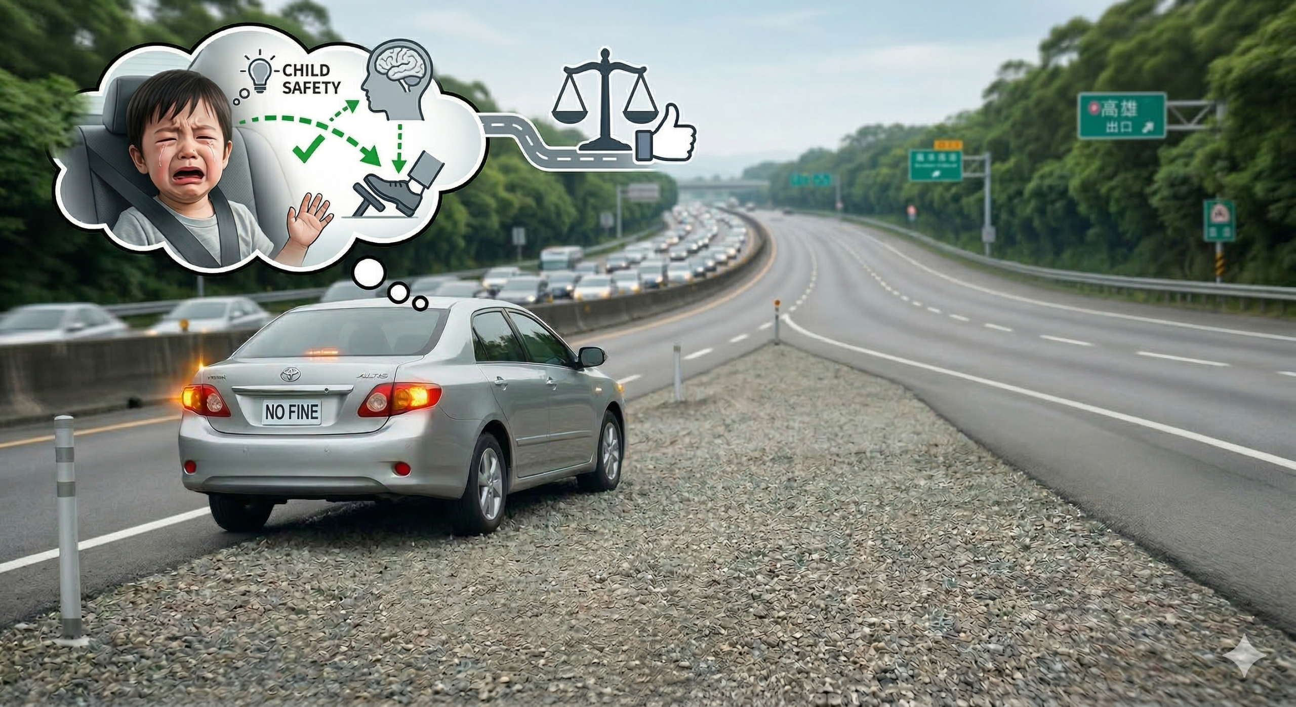 Liao challenged the penalty in court, explaining that he was driving with two young children when one of them suddenly pulled the rear door handle while the vehicle was moving. Concerned that the door might open, and with a tunnel approaching and vehicles in the outer lane preventing an immediate pull-over, he slowed down while looking for a safe place to stop.
