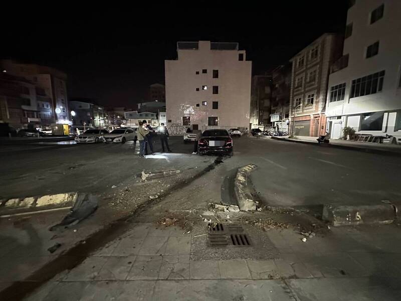 The incident occurred around 3:30 a.m. at the intersection of Jhongshan 2nd Road (中山二路) and Lingya 2nd Road (苓雅二路). According to the Kaohsiung City Police Department’s Lingya Precinct, the driver, surnamed Chang (張), suddenly veered left while traveling behind another vehicle and accelerated across the oncoming lane, striking several YouBike docking posts on the sidewalk before crashing into an adjacent parking lot.