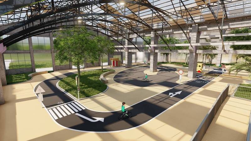 Covering about 1.5 hectares, the park will reuse the former freight workshop structure, preserving its industrial character while creating a semi-indoor activity space protected from sun and rain.