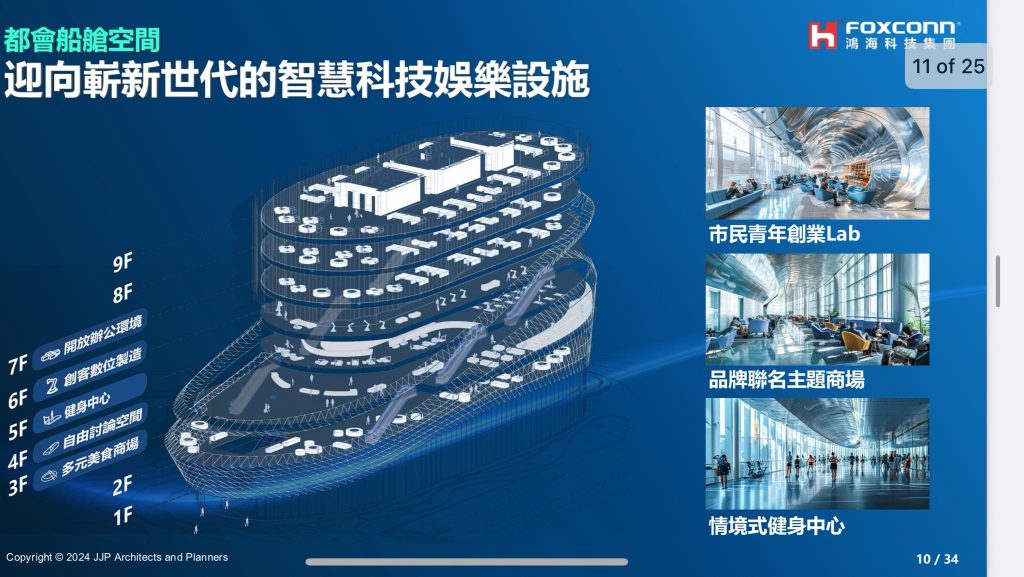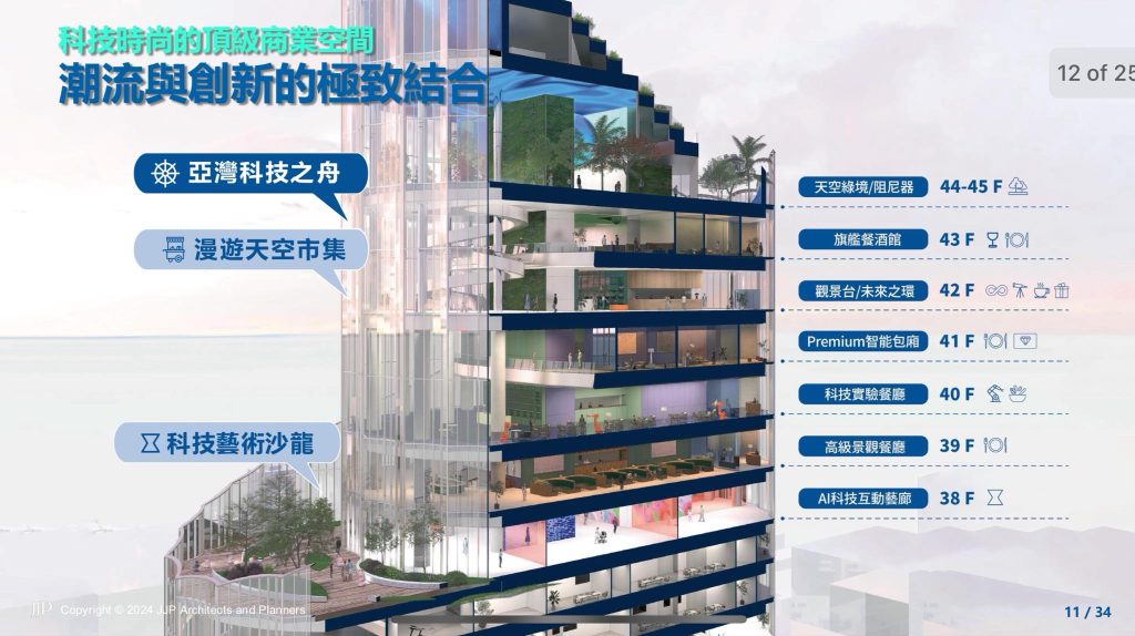 - 45-story office tower, approximately 234 meters in height. The tower will feature commercial space at both the podium and upper levels, with an observation deck and art gallery at the top. The 36th floor will house a corporate exhibition and presentation center. Total office space will span approximately 20,000 ping.