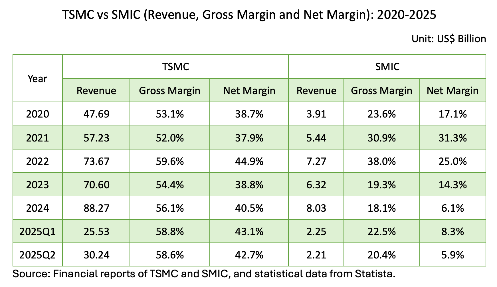 SMIC’s revenue has also expanded rapidly, rising from around US$3.9 billion in 2020 to about US$8 billion in 2024, and reaching roughly US$4.5 billion in the first half of 2025, with full-year revenue likely to exceed US$9 billion. Yet this growth has come at the expense of profitability: gross and net margins fell from 38% and 25% in 2022 to 18.1% and 6.1% in 2024, deteriorating further in the second quarter of 2025.
