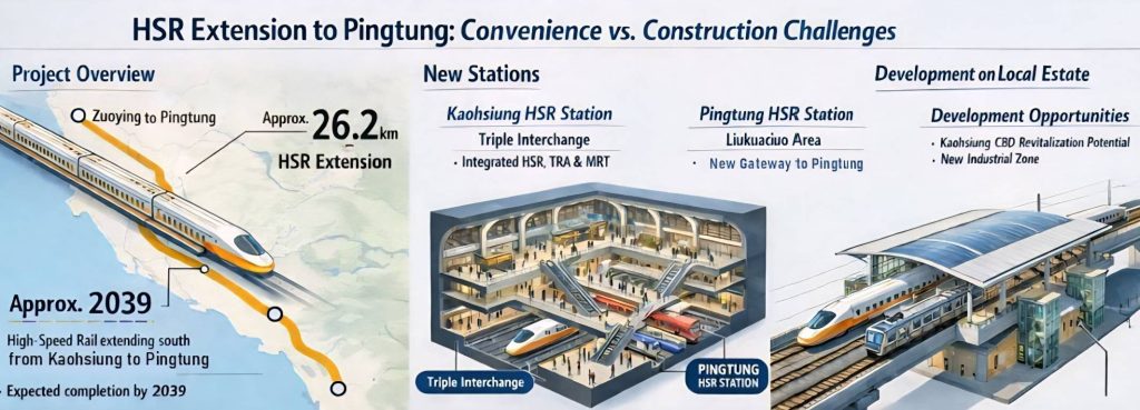 KAOHSIUNG — Taiwan’s High-Speed Rail (HSR) southern extension to Pingtung is planned to run approximately 26.2 kilometers from Zuoying in Kaohsiung to a new terminal station in Pingtung, with completion currently projected around 2039. The approved “Kaohsiung plan” follows existing railway corridors and includes two major new stations: an underground HSR station near Kaohsiung Main Station designed as a three-line interchange linking HSR, Taiwan Railways (TRA), and Kaohsiung Metro, and a new Pingtung HSR station in the Liukuaicuo area, planned as a shared facility with TRA.