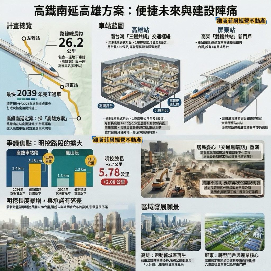 Government officials say the project is expected to shorten travel times, integrate Pingtung into Taiwan’s high-speed rail network, and support the development of a Kaohsiung–Pingtung regional living and economic zone. Urban planners also project redevelopment around Kaohsiung Main Station and new growth opportunities in Pingtung linked to the rail hub.
