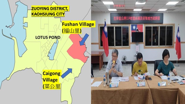 Above left: A Wiki map of Zuoying District, Kaohsiung City. Right: Zuoying District directors outline on consolidation plans during a Sept. 17, 2025 meeting. Image via Kaohsiung City Govt. policy details to the village chiefs