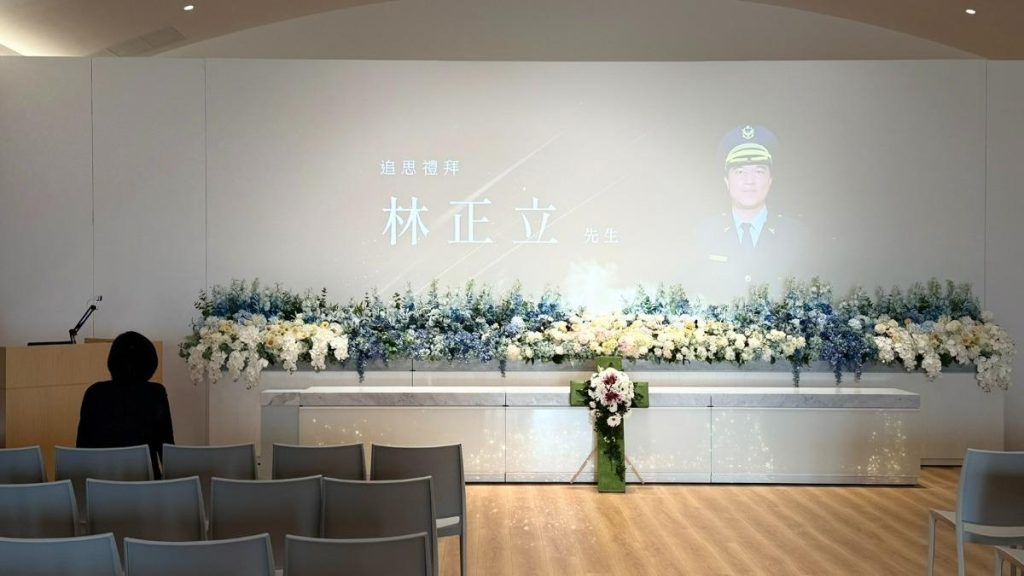 The farewell ceremony was held at the Lung Yen funeral hall in Kaohsiung, with flower arrangements sent by police colleagues and political figures, including Kaohsiung Mayor Chen Chi-mai (陳其邁), Interior Minister Liu Shih-fang (劉世芳), former Control Yuan president Chen Chu (陳菊), and senior police officials from Kaohsiung and Taipei.
