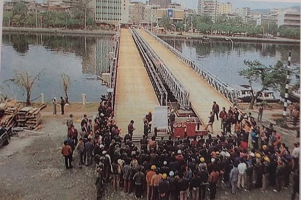 5 -6. Caption: “A ‘Bailey Bridge‘ spanning the Love River officially opened to traffic at 6 a.m. on New Year’s Day, 1983. Built with assistance from the ROC military to meet an urgent deadline, the bridge was widely welcomed by the public for its convenience. It helped ease traffic congestion caused by the reconstruction of the Kaohsiung Bridge. The 141-meter-long Bailey Bridge was completed in just three to four days by more than 100 combat engineers from the Southern Army Corps’ engineering unit. Once the new bridge work was completed, the Bailey Bridge was dismantled.