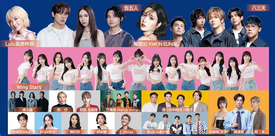 The local bill brings both popularity and punch: Accusefive [告五人], 831 [八三夭], Xiong Zai [熊仔], Fire EX. [滅火器], Feng Xiaoyue [鳳小岳] & Ya Ke Li Shizi [壓克力柿子], Gu Gu Lu Si-wei [鼓鼓呂思緯], Chen Xin-yue [陳忻玥], Mangguo Jiang [芒果醬], Qiu Shu-chan [邱淑蟬], Hong Wei-zhe [洪暐哲], AcQUA Yuan Shaonian [AcQUA 源少年], Angie An-ji [Angie 安吉], Ponay’s Original Big Band [Ponay的原式大樂隊], and Wing Stars. A special youth‑stage collab pairs Gu Gu and AcQUA exclusively for Kaohsiung. International shine comes from KWON EUNBI [權恩妃], the “water‑gun queen,” who greeted fans via a cross‑sea video.