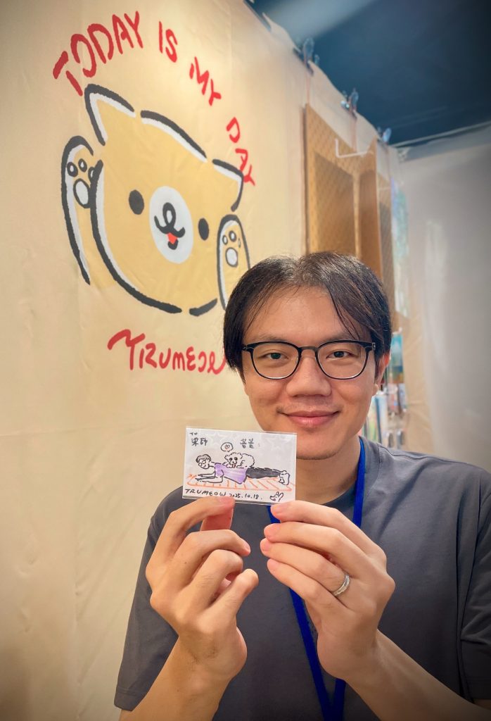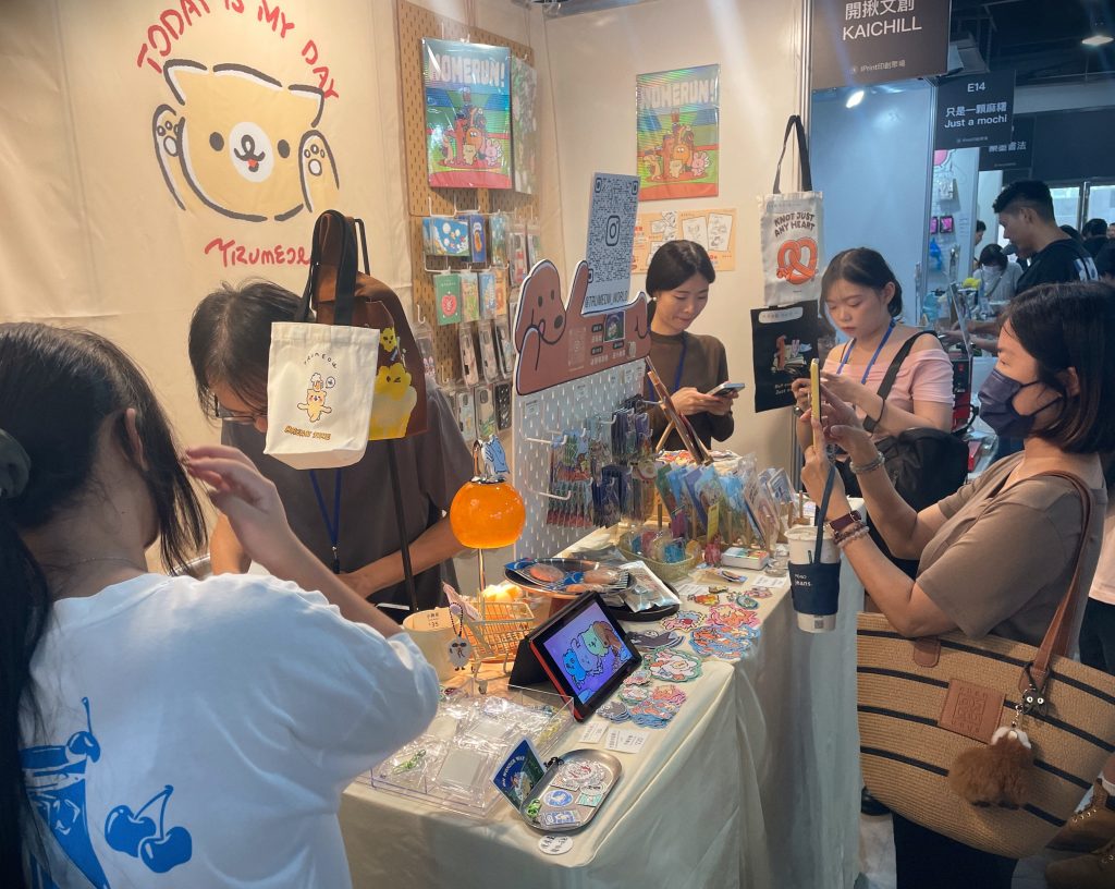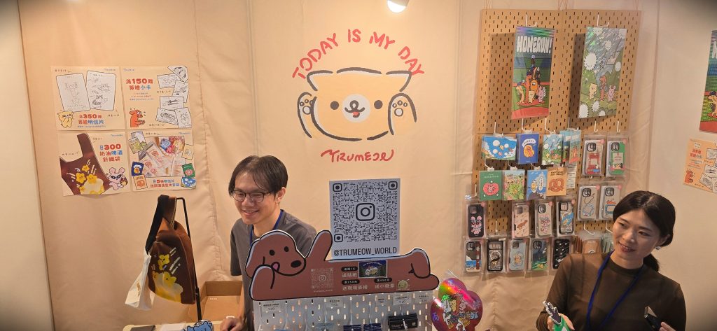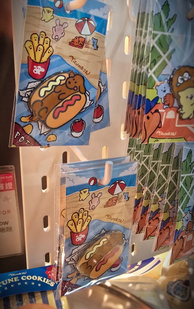 Among them was Trumeow (奶油貓咪咪). Their booth felt like stepping into a pastel daydream. Their tiny acrylic charms and sticker packs were drawn in a style both children and adults would love, with hot-dog bears sunbathing on a beach and fortune cookies stamped with cheerful cats. What stood out most wasn’t just the merchandise but the interaction. The artists behind the counter sketched quick, personalized drawings for visitors, each line a spontaneous collaboration between creator and fan.