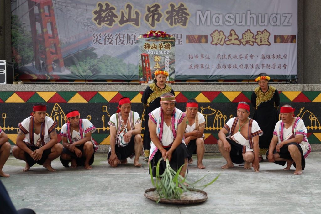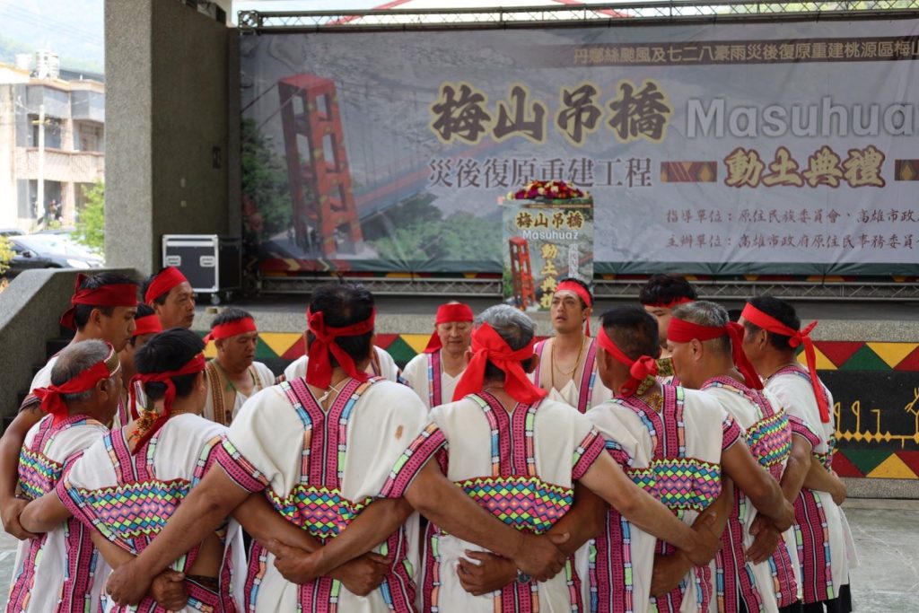 The groundbreaking ceremony was held on Tuesday at the Meishan sports field, where community members offered a blessing with a traditional Bunun eight-part harmony performance. The bridge was damaged by a typhoon and torrential rains last summer, according to the Kaohsiung City Government’s Indigenous Affairs Commission.