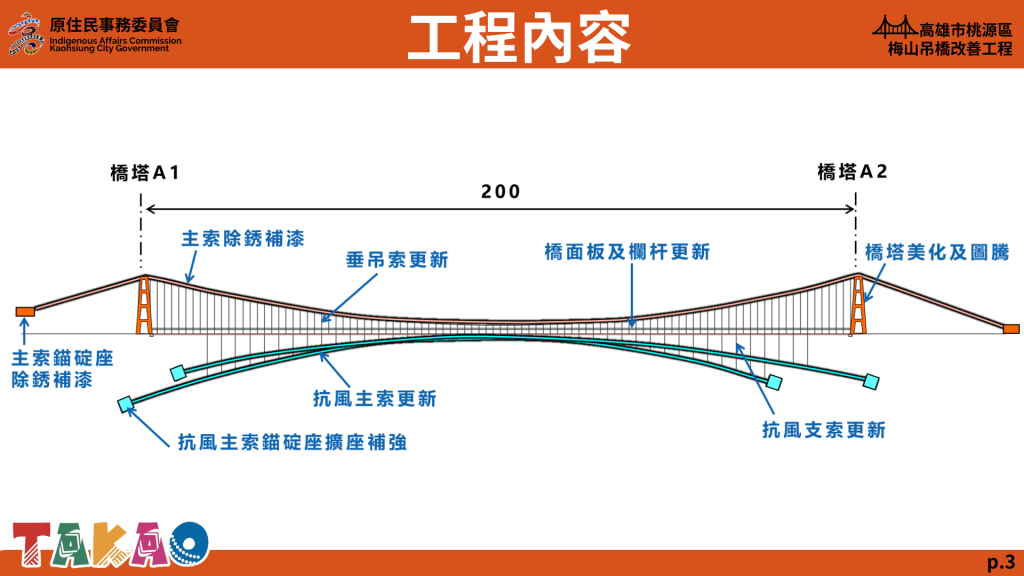 KAOHSIUNG — Reconstruction work has begun on the Meishan Suspension Bridge in Meishan Village (梅山里) in Kaohsiung’s Taoyuan District (桃源區), with city officials saying the project will strengthen transport access, improve disaster resilience, and support local agriculture and tourism after storm damage.