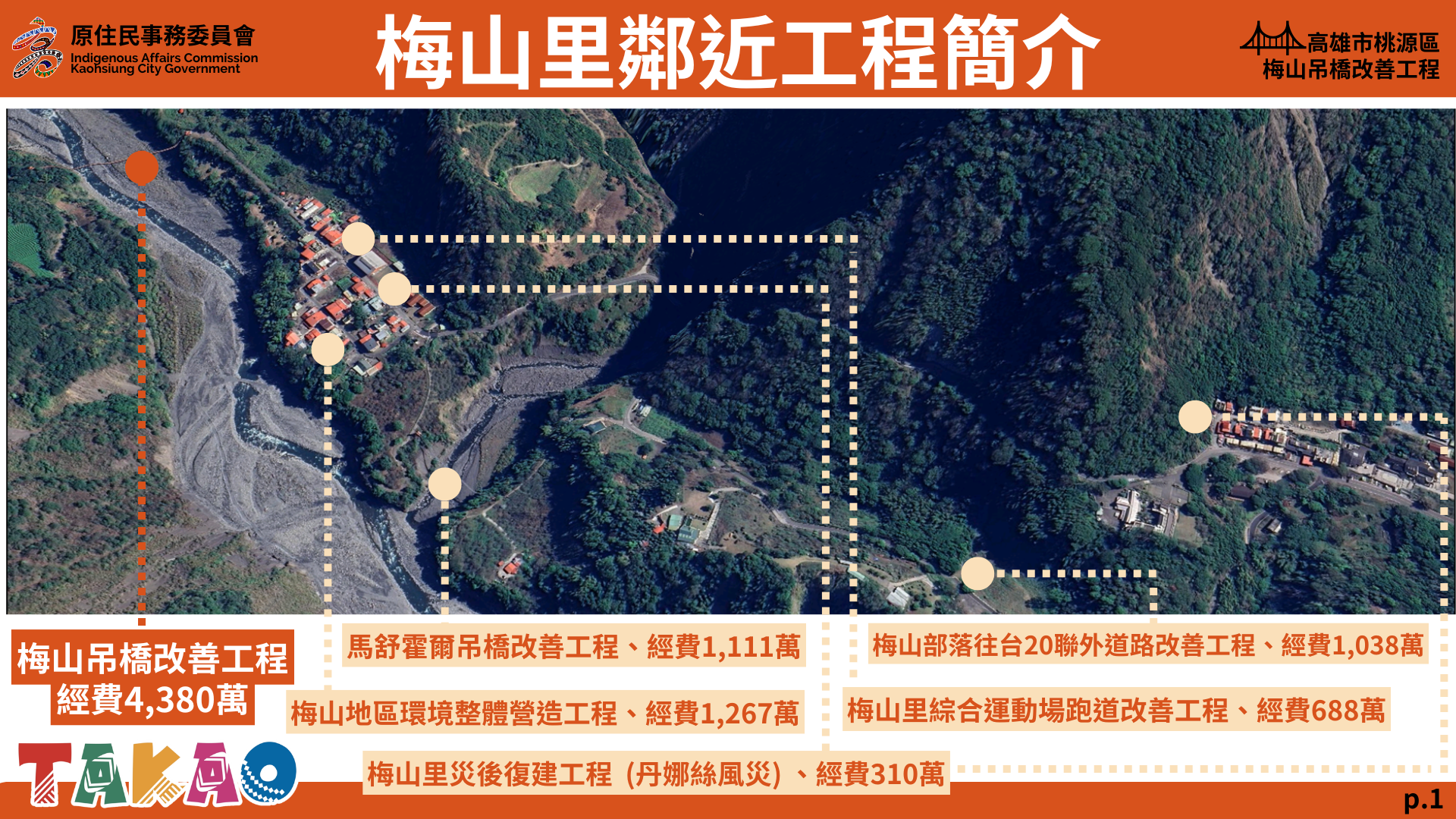 Deputy Minister of the Council of Indigenous Peoples Kumu Hacyo (谷縱.喀勒芳安) said the central government had allocated NT$9.7 billion in special funding for Kaohsiung’s three Indigenous districts following Typhoon Danas, including NT$5.8 billion for Taoyuan District across 15 projects. The Meishan bridge reconstruction is one of those projects, he said.