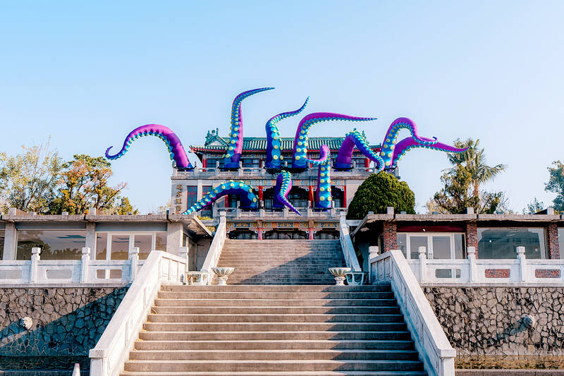 An exhibit of the “Tentacles” art attack series by Filthy Luker and Pedro Estrellas is now on display at Kaohsiung’s Chengcing Lake Tourist Center. This photograph was released by the KH City Govt. yesterday. The inflatable tentacles move with the wind, giving the impression of life.