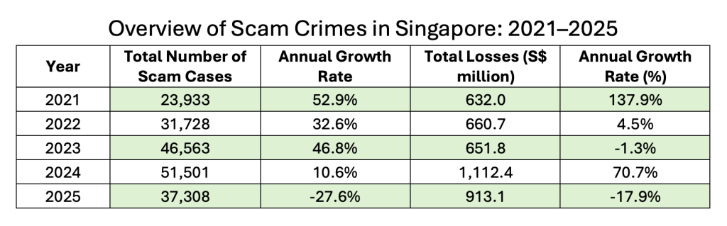 With sustained community outreach and cross-border enforcement cooperation, policy efforts have reached a turning point. In 2024, there were 51,501 reported scam cases, with annual growth moderating to 10.6%. In 2025, a rare “double decline” occurred: cases fell by 27.6% to 37,308, and total financial losses decreased by 17.9%—approximately S$200 million—to S$913.1 million. Nevertheless, losses remain elevated, exceeding the average of approximately S$260 million recorded in the three years prior to 2024.