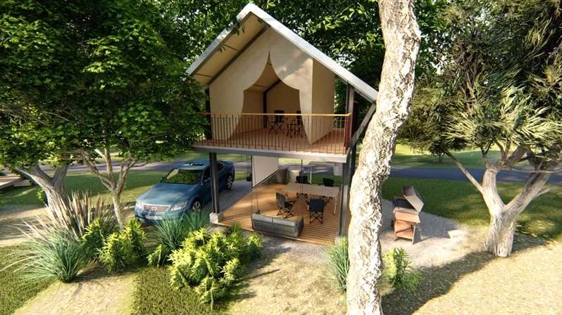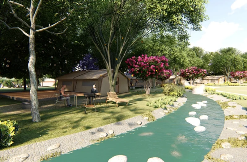 Beyond camping facilities, the park will feature orchards, open grassland areas, and themed installations designed as photo spots, including cave-style structures and a torii-inspired gate feature. A visitor center will also be built to support tourism services and programming.