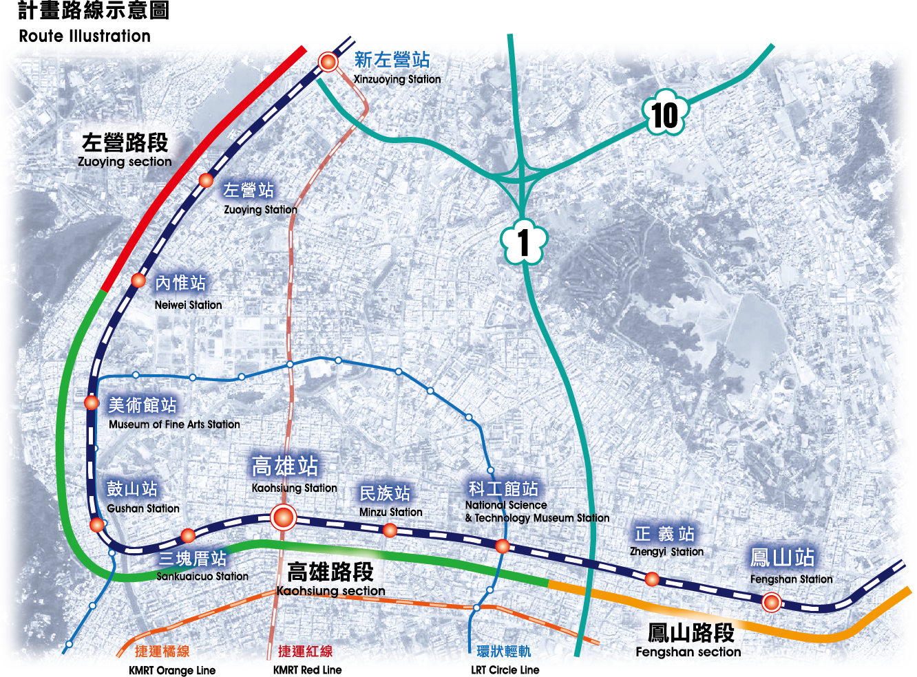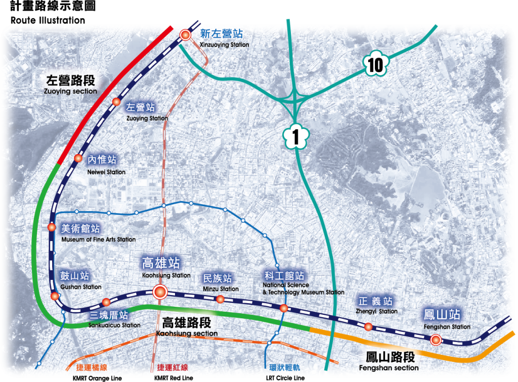 The Kaohsiung Urban Railway Underground Project, running from the new Zuoying Station to Dazhi Overpass at Fengshan zone, covers a length of approximately 15.37 kilometers, it began operations on October 14, 2018.