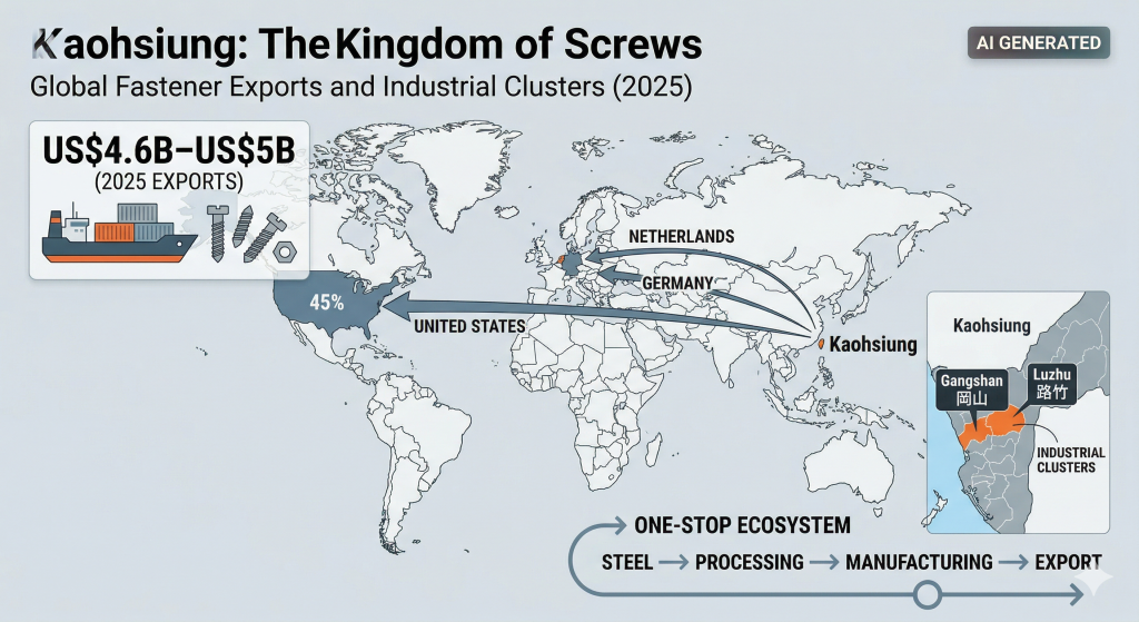 KAOHSIUNG — Taiwan’s fastener industry, centered in the industrial clusters of Gangshan (岡山) and Luzhu (路竹), is accelerating its transition toward high-precision and low-carbon manufacturing as the sector prepares for the 8th Taiwan International Fastener Show (Fastener Taiwan 2026) taking place at the Kaohsiung Exhibition Center April 22-24