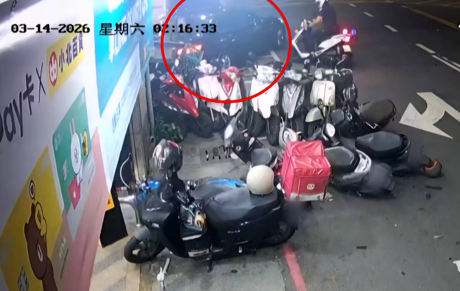 According to the Sinsing Precinct (新興分局), officers were called at about 2:30 a.m. to a crash outside a business on Jhongjheng 4th Road (中正四路) in Cianjin District (前金區). Police said the driver, surnamed Lai (賴), slammed his car into a long row of scooters parked along the roadside. No injuries were reported.