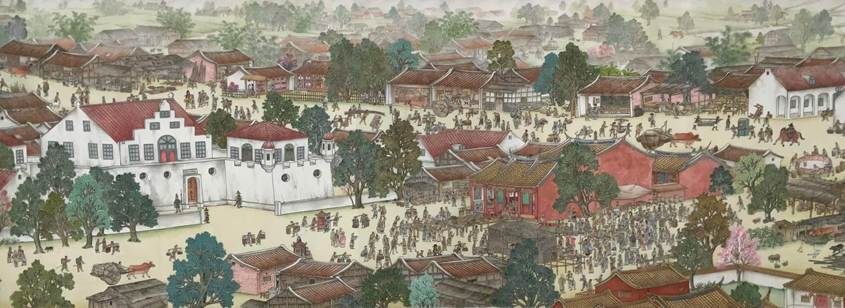 Above: A scene of what is today Tainan City, from Dr. Chen Yao-chang’s A Tale of Three Tribes in Dutch Formosa, painted by Master Shen Jian-long (沈建龍).