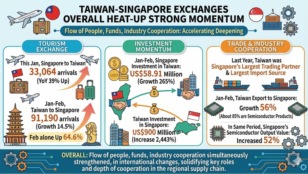 Recent exchanges between Taiwan and Singapore have been gaining clear momentum. From tourism flows and capital movements to industrial cooperation, key indicators are strengthening in tandem, signaling that bilateral relations are entering a new phase of deepening engagement.