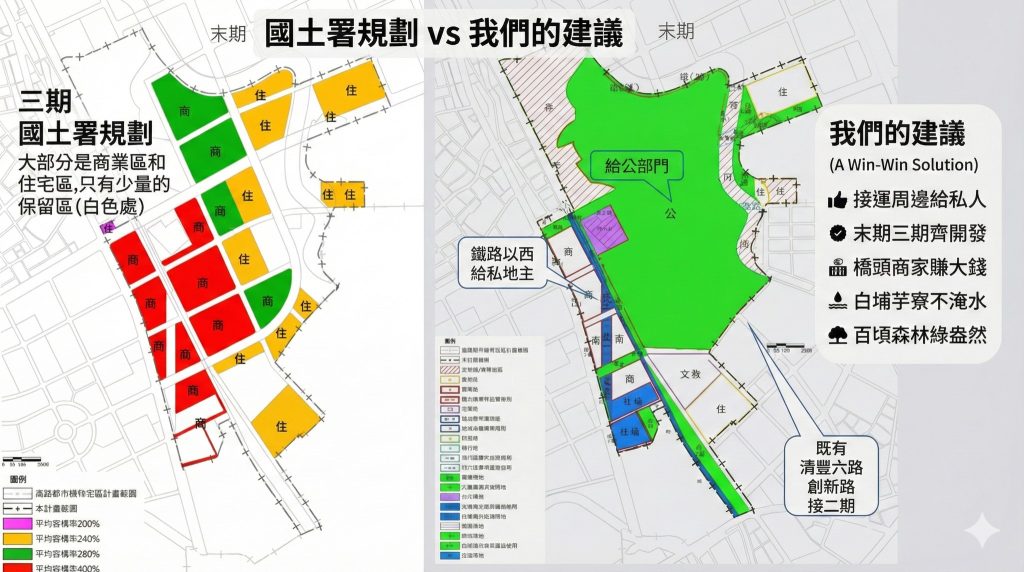 Beside the MRT stands the century-old Ciaotou Sugar Factory, where a precious expanse of forested green space now faces the threat of being “cut open” by the National Land Management Agency—trees felled and roads laid through its heart. After 28 years of new town development, more than 70 percent of the land remains idle, raising the question: why must this Hundred-Hectare Forest, which helps moderate extreme heat, purify the air, and absorb rainwater, be sacrificed?